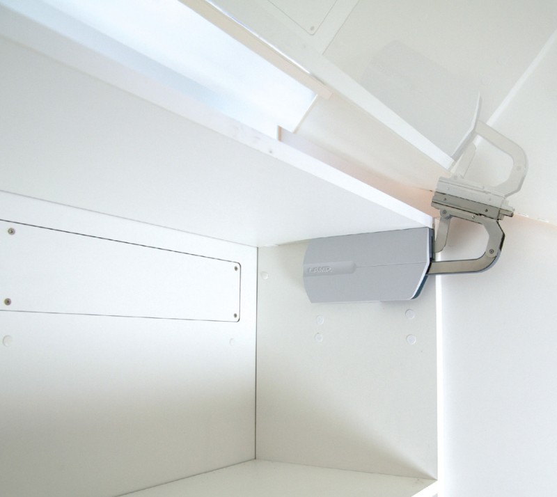 - Mehhanism paigaldatakse kapi sisemuse ülaossa, jättes rohkem kasutatavat ruumi ning võimaldades riiuleid mugavamalt paigaldada.